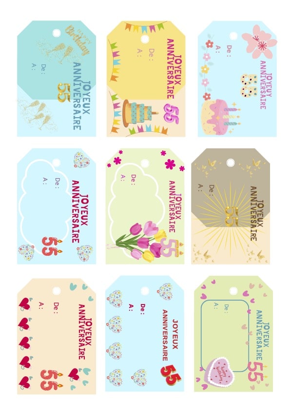 Pour accompagner vos cadeaux pour une femme de 55 ans, vous pouvez télécharger nos étiquettes anniversaire femme gratuites et les imprimer au format A4. C’est gratuit, profitez-en ! Il suffit d’indiquer votre adresse email ci-dessous pour recevoir ces belles étiquettes spéciales anniversaire femme de 55 ans.