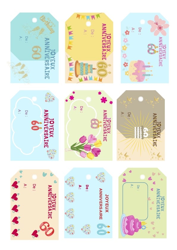 Pour accompagner vos cadeaux pour une femme de 60 ans, vous pouvez télécharger nos étiquettes anniversaire femme gratuites et les imprimer au format A4. C’est gratuit, profitez-en ! Il suffit d’indiquer votre adresse email ci-dessous pour recevoir ces belles étiquettes spéciales anniversaire femme de 60 ans.