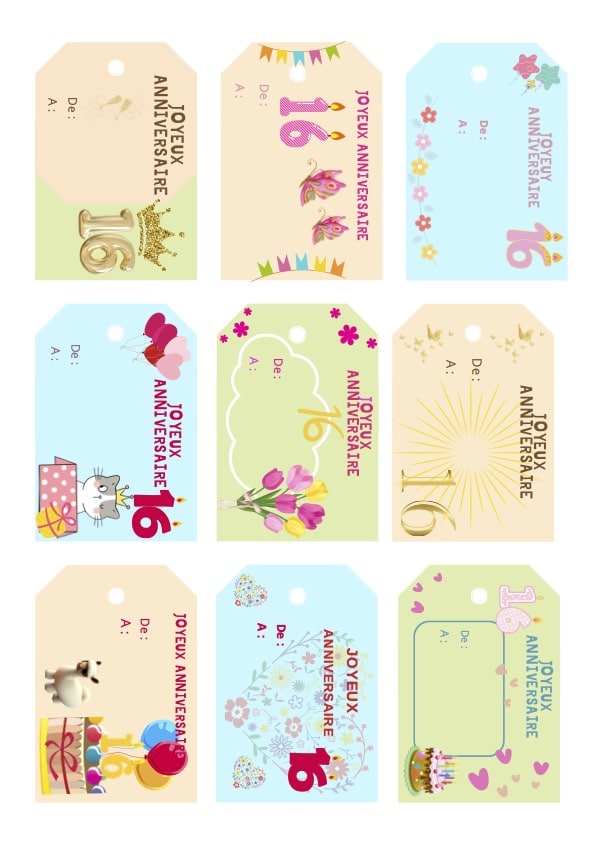 Belles étiquettes Anniversaire fille 16 ans à imprimer