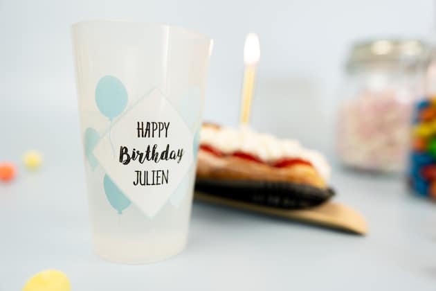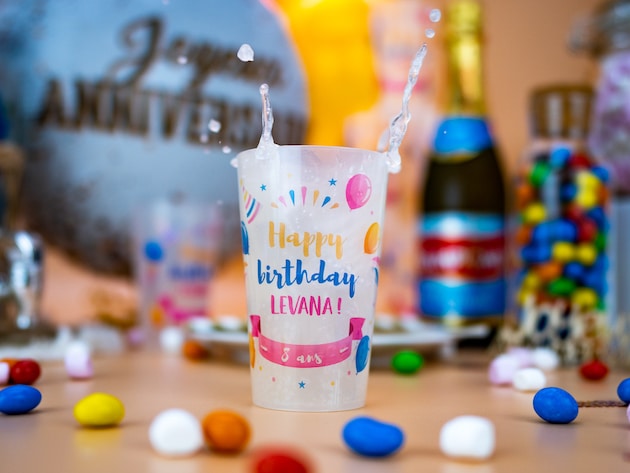 7. Distribuez les gobelets lors de la fête : Lors de la fête, placez les gobelets personnalisés sur une table dédiée, ou distribuez-les à l’arrivée à vos invités. Cela ajoutera une touche spéciale à la soirée.